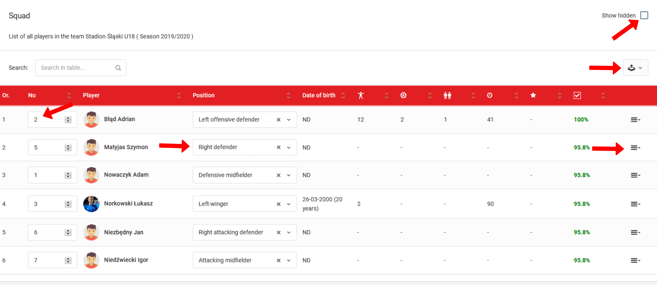 V pravém horním rohu obrazovky najdete dva důležité prvky. První - zaškrtávací políčko "zobrazit skryté" slouží k zobrazení všech hráčů skrytých během sezóny. O skrývání a odstraňování hráčů si můžete přečíst v dalších kapitolách průvodce.