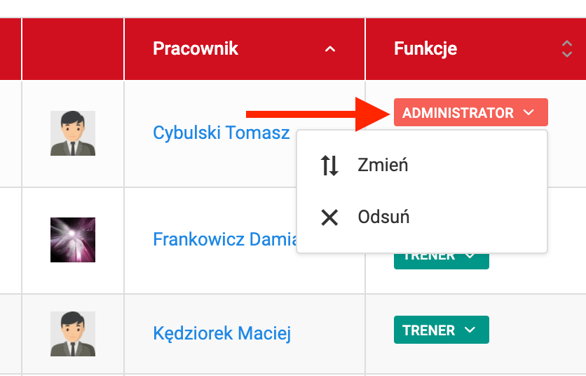 Aby usunąć lub zmienić pracownikowi rolę, kliknij w kolorowe kafelki znajdujące się przy imieniu i nazwisku pracownika. Po kliknięciu pojawią Ci się do wyboru dwie opcje: "odsuń" oraz "zmień". Odsunięcie oznacza odebranie danej roli użytkownikowi, natomiast klikając zmień, będziesz mógł edytować aktualną rolę.